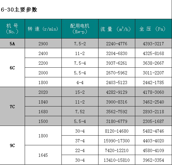 详细说明:6-30型离心通风机排送的介质为空气及无腐蚀性、不自燃、不含有粘性物质气体,其温度不超过80℃。该风机具有压力较高,流量较小的特性,适于粮食棉花等加工时的风力输送。