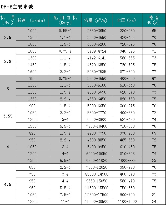 详细说明:DF-E型离心式空调风机具有风量大、噪声低、结构紧凑、坚固耐用、外形美观、安装使用方便的特点。该风机广泛适用于各种空调机组、空气幕等,亦可用于工矿企业、公共场所的室内通风换气。它所输送的介质为空气和其它不自燃的对人体无害的气体,气体内不允许有颗粒物质,含尘量不大于150mg/m3。